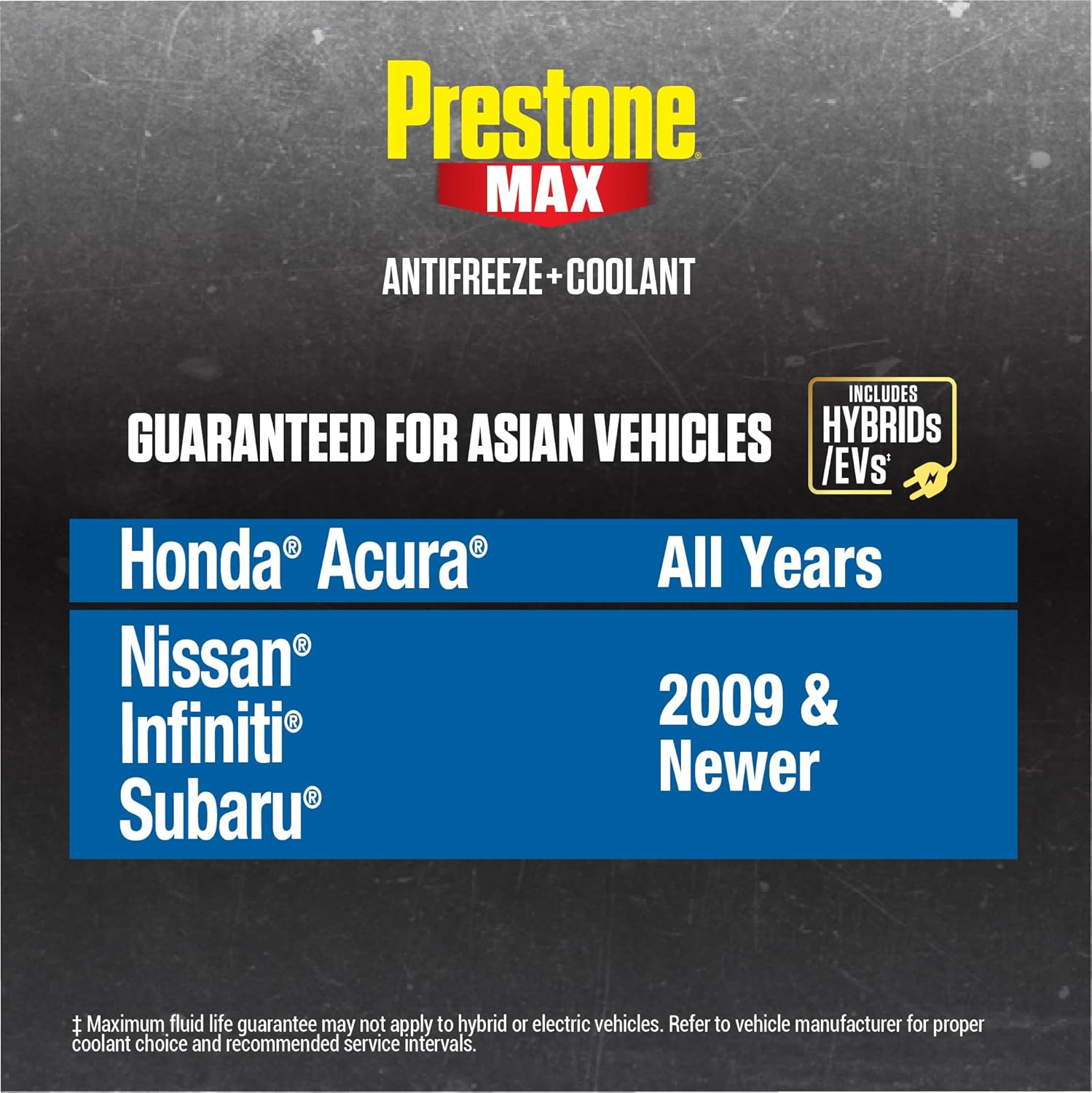 Fórmula premium para todos los vehículos Honda y Acura, Nissan a partir de 2009, Infiniti a partir de 2009 y Subaru a partir de 2009. Nuestra tecnología mejorada y patentada proporciona protección inmediata a todos los motores, nuevos y antiguos. Optimiza la temperatura del motor, previene la congelación y protege las piezas de la sedimentación y la corrosión. La Protección Superior de Prestone se encarga de todo el trabajo, mientras que el anticongelante + refrigerante ordinario sólo proporciona dos tercios del trabajo.